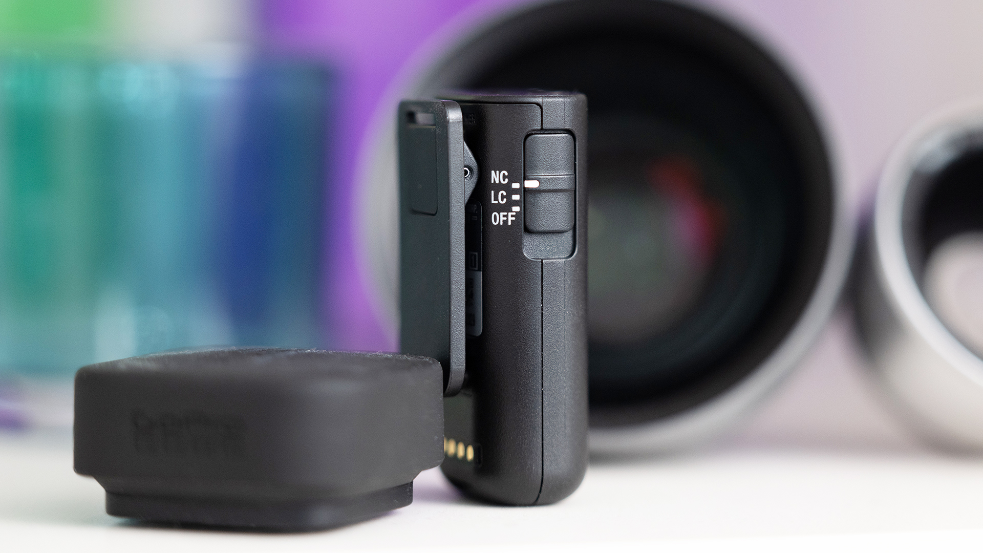 EMPFÄNGERWas sofort auffällt, sind die kompakten Maße des Empfängers. Mit ungefähr 32 x 29 x 50 Millimetern gehört er zu den kleineren Vertretern seiner Zunft, was vor allem das Ausbalancieren am Gimbal erleichtert. Verzichten muss man dafür auf ein Display, stattdessen informieren drei LEDs über Verbindung und Akkustand. Zusätzlich zum Multifunktionsschuh-Adapter dienen eine klassische TRS-Buchse sowie ein USB-C-Anschluss der Verbindung mit Kameras, Smartphones oder Computern. Die Umschaltung zwischen analogem und digitalem Ausgang erfolgt manuell via Schieberegler, im Digitalmodus gibt der Empfänger das Signal mit 24 Bit und 48 Kilohertz aus, was dem Studiostandard entspricht. Ein weiterer Schieberegler steuert, ob das Signal als zusammengemischter Stereoton ausgegeben oder jeder Sender seinen eigenen Kanal bekommen soll. Der einzige Taste am Gehäuse aktiviert die Sicherheitsaufnahme, bei der die Funkstrecke das Stereosignal in zwei Pegeln ausgibt, davon einer normal, der andere 20 Dezibel leiser – gut zum Schutz vor Übersteuerungen beim Einsatz in lauten Umgebungen.