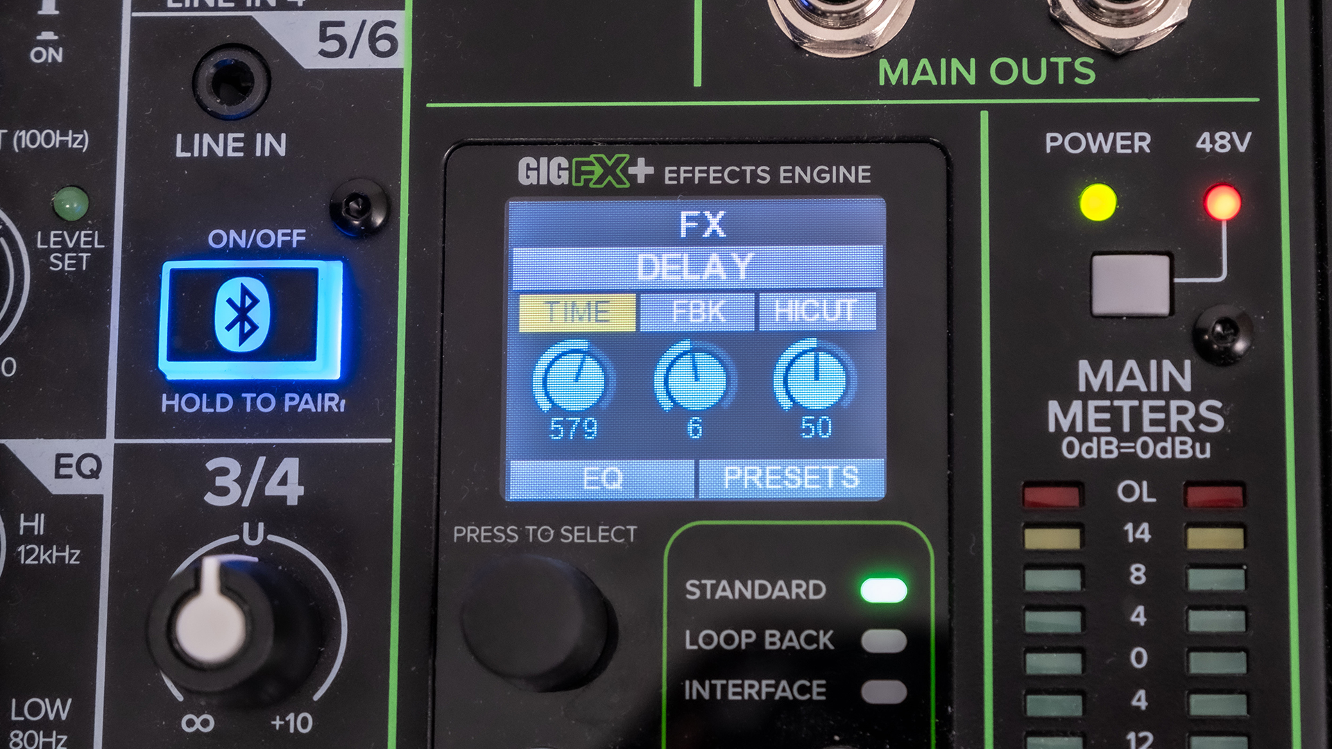 PRAXIS - LIVE Dass die Bedienung der beiden Mono-Kanalzüge ein Kinderspiel für diejenigen ist, die ein klassisch aufgebautes Mischpult kennen, muss man nicht erwähnen. Mackie hat diese Arbeitsweise jedoch auch über das Gerät beibehalten. So navigiert man mittels Dreh/Drückregler und Zurück-Taste schnell durch die Digitaleffekte. Die Drehregler bieten genug Widerstand für präzises Arbeiten und verfügen mit Ausnahme der Potis für Vorverstärkung und Kopfhörerlautstärke über eine gerasterte Mittelstellung. Damit sind kleinere Mischungen problemlos, beispielsweise im Singer-Songwriter-Bereich. Bluetooth-, TRS- und USB-Anschluss platzieren das Mackie aber genauso gut in Podcast-Situationen und Livestream-Setups, bei welchen sich ein eigener Audiomischer ob des unkomplizierten Angleichens zahlreicher Eingangspegel lohnt. Gerade der Bluetooth-Eingang ist bei Mischpulten nicht selbstverständlich und ermöglicht spontanes Einspielen vom Handy, auch wenn dieses keine Klinkenbuchse mehr besitzen sollte.