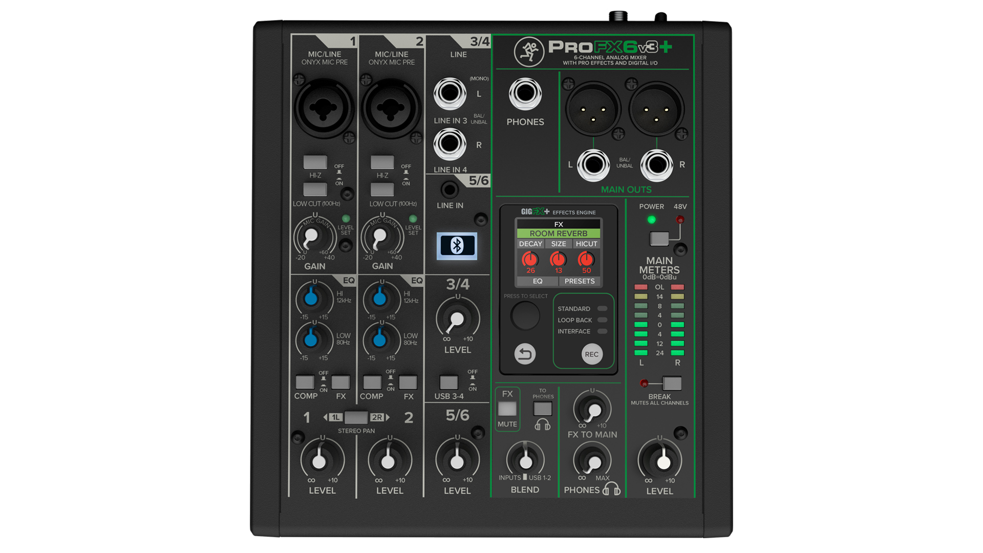 EFFEKTE UND MONITORINGDas ProFX6v3+ verwendet Mackies GigFX+-Engine, welche drei Delays (klassisch, Echo und Slapback), drei Reverb-Effekte (Hall, Raum und Plate), zwei Choruse und einen Flanger beinhaltet. Mit Delay+Reverb, Delay+Chorus und Reverb+Delay sind zudem drei Kombinationen mit an Bord. Sechs Presets können abgespeichert werden, zusätzlich verfügt das Mischpult über einen einbandingen parametrischen Equalizer (400 Hz – 16 kHz) mit zusätzlichem High- und Low-Pass-Filter. Mittels einer Taste unter der Effekt-Sektion kann man die Effekte stummschalten und das trockene Signal über eine weitere Taste an den Kopfhörer-Ausgang weiterleiten. Unter beiden Tasten befindet sich der Blend-Regler für die stufenlose Regelung zwischen Input- und USB 1-2-Signal. Darüber lässt sich beispielsweise für Sprach- und Gesangsaufnahmen eine individuelle Abstimmung zwischen Feedback und Playback treffen, auch für Streaming und Aufnahmen am Rechner ist diese Regelung optimal. Stufenlose Regler für Kopfhörer-Lautstärke und FX-Zumischung zum Hauptsignal runden das Steuerpanel ab.