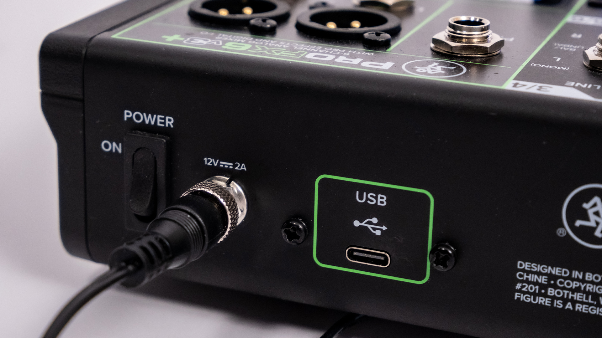 Der rückwärtige USB-C-Anschluss erlaubt den Einsatz des Mackie ProFX6v3+ als Interface am Schnittrechner.