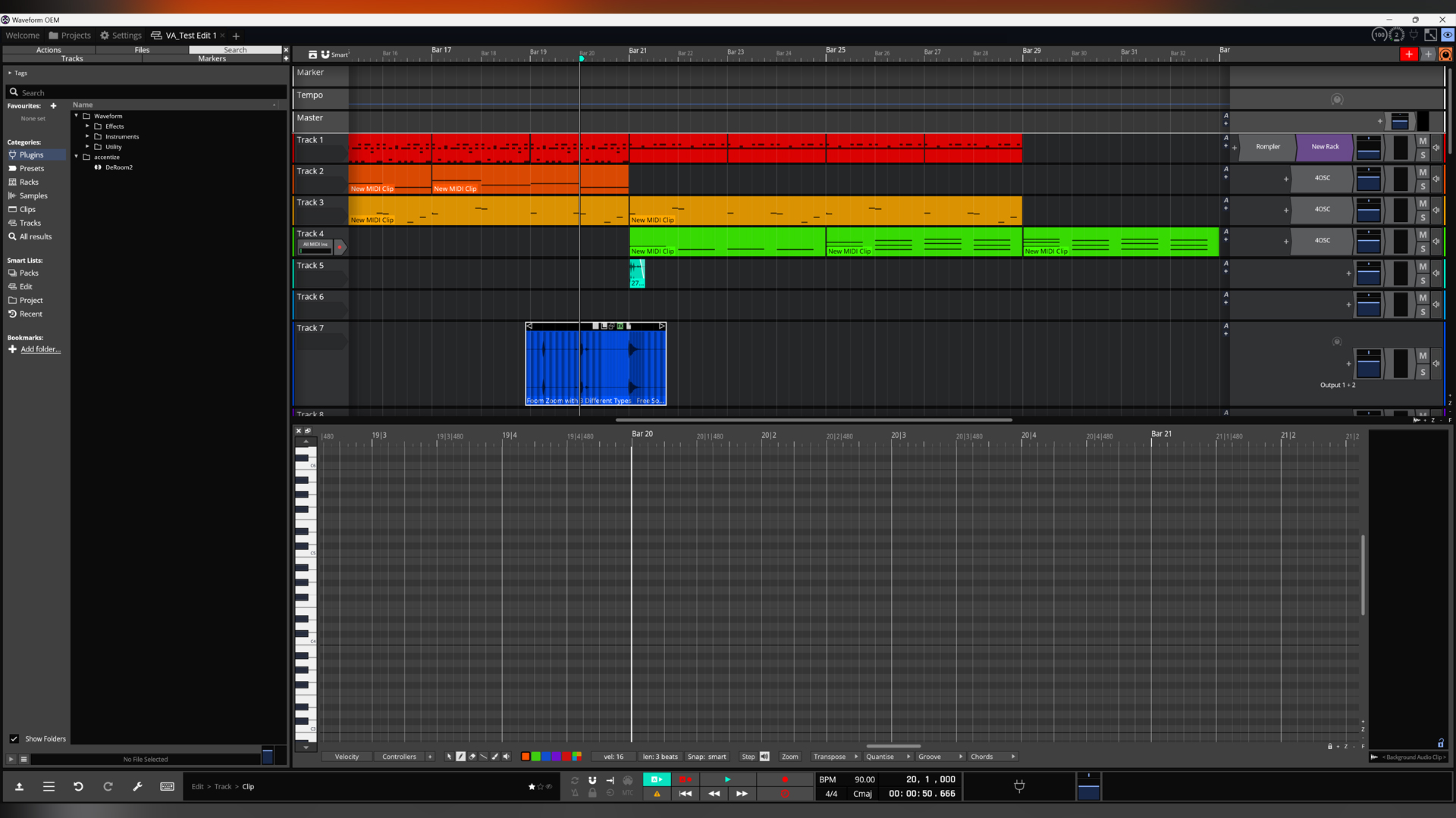 Als Schnellstart liefert Mackie die DAW Waveform des Herstellers Tracktion in der reduzierten OEM-Version mit. Für Audioanwendungen ist diese jedoch absolut brauchbar und nach kurzer Eingewöhnung schnell verständlich. Uns gefällt, dass Tracktion ihrer Software anders als andere Hersteller keine Restriktionen bezüglich Spurenlimit oder Plugin-Kompatibilität auflegen. Im Gegensatz zur „großen“ Version muss man mit weniger Plugins leben, trotzdem sind alle zur Audiobearbeitung wichtigen Effekte mit an Bord.