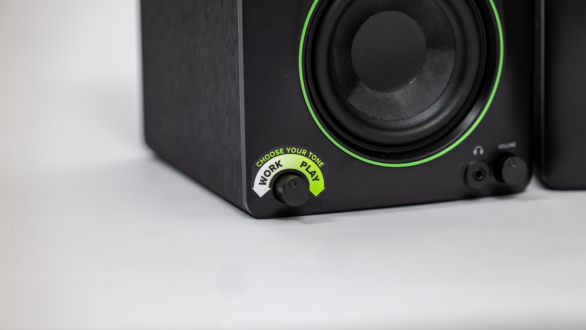 Mittels Drehregler stellt man stufenlos zwischen neutralem und Hi-Fi-Sound um. Daneben platziert Mackie den Kopfhöreranschluss, der bei eingestecktem Kopfhörer die Lautsprecher stummschaltet.
