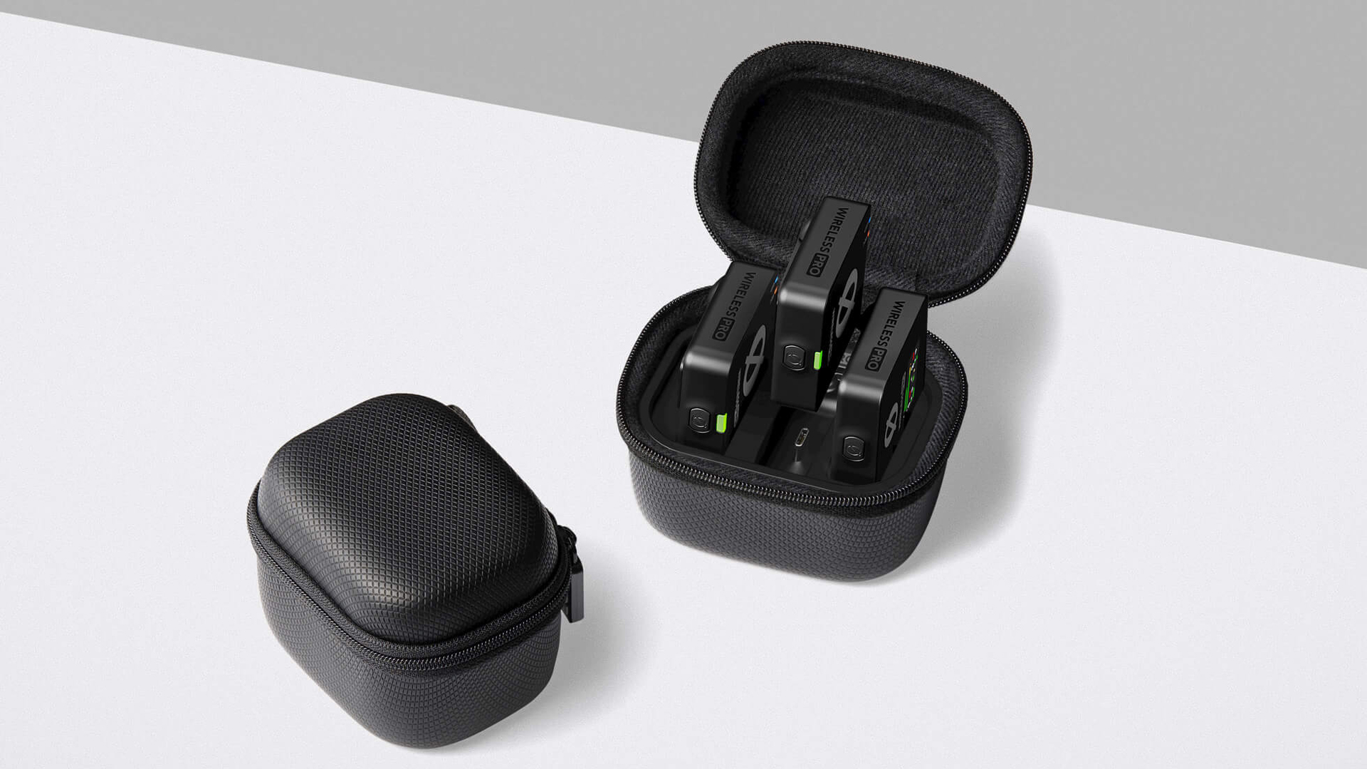 Die Ladeschale ist beim Wireless Pro serienmäßig. Die zweite Tasche nimmt Kabel, Lavaliermikrofone und Windschutze auf.