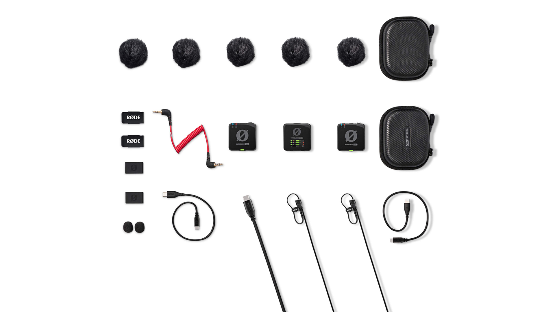 Zum Lieferumfang des Wireless Pro gehören Windschutze, Lavalier-Mikrofone, Adapterkabel und Magneten.