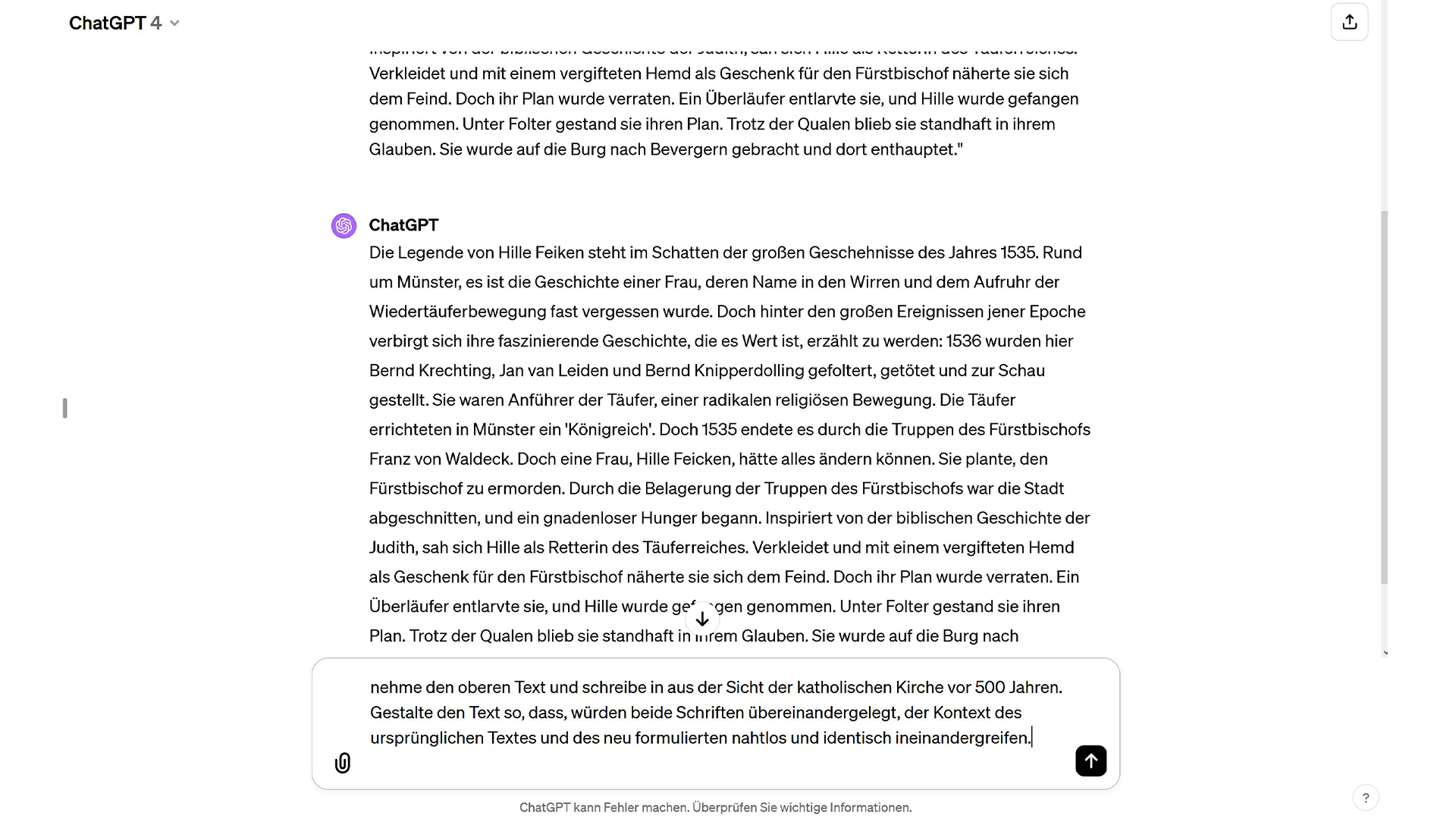 Beim Video über Hille Feiken, einer Wiedertäuferin aus dem 16. Jahrhundert, war zur Erforschung der historischen Person umfangreiche Recherche nötig. So griff ich sowohl auf Online-Quellen als auch auf spezifische Informationen vom Stadtarchiv Münster und dem Landesverband Westfalen-Lippe (LWL) zurück. Mit diesen zusätzlichen Daten konnte ChatGPT ein facettenreiches Video-Skript mitsamt Dialogen erstellen, was mich durch die Perspektivenvielfalt dazu inspirierte, gleich drei Videos zu produzieren: Eines aus der Sicht der Wiedertäufer, eines aus der Perspektive der katholischen Kirche von vor 500 Jahren und eines, das Hille Feiken aus heutiger Sicht betrachtet. War sie eine Heldin, eine Märtyrerin ihres Glaubens, oder das Produkt einer extremen Ideologie? Dabei bleiben in allen drei Videos die Bilder gleich, nur der Text ändert sich in den entsprechenden Sichtweisen. Auch das kann ChatGPT sehr gut. Dazu gibt man gibt der KI das Skript aus der Sicht der Wiedertäufer und sagt der KI, es soll den Text aus der Sicht der katholischen Kirche vor 500 Jahren, mit gleichen Textbausteinen und gleicher Skriptlänge machen. Nach ein paar Änderungen an der einen oder anderen Stelle, passt dass dann schon gut. Die Arbeitserleichterung ist auf jeden Fall enorm.
