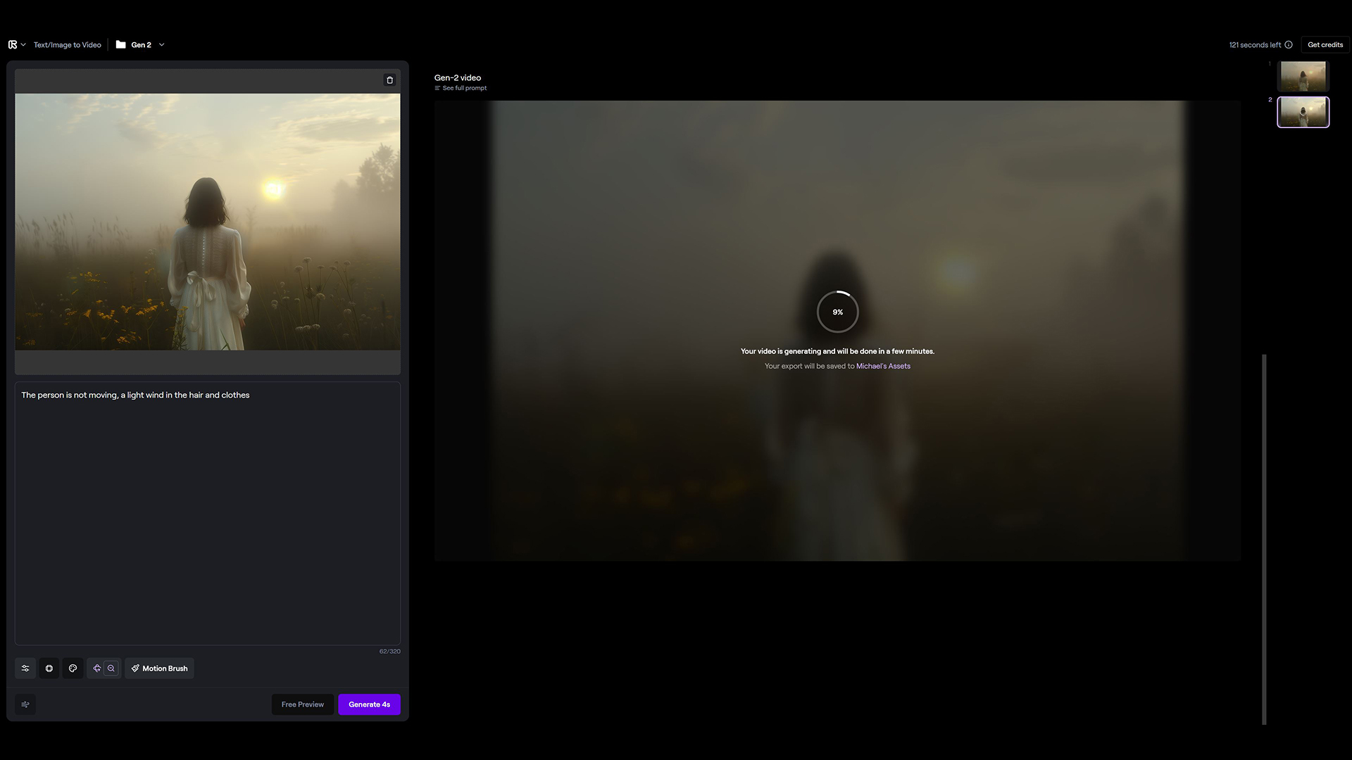 VOM BILD ZUM VIDEOFür die Bewegtbildgenerierung wende ich mich an Runway, die derzeit führende KI auf diesem Gebiet. Dort lade ich die zuvor erstellten Bilder hoch und lasse die KI kurze Videosequenzen von bis zu vier Sekunden Länge generieren. Die Möglichkeiten zur Anpassung, wie Kamerafahrten oder das Maskieren bestimmter Bildbereiche, eröffnen kreative Freiheiten, auch wenn die KI bei der Bewegung von Menschen und Tieren manchmal noch zu unerwarteten Ergebnissen führt. Wer schonmal mit KI-Werkzeugen versuche gemacht hat weiß, dass die Video-KI Personen oder Tiere in der Bewegung oft nicht richtig darstellen kann. Deshalb lässt man Personen sich nur ganz wenig oder gar nicht bewegen. Beispielsweise gibt man die Anweisung: „Person soll sich nicht bewegen, leichter Wind, sichtbar an den Haaren der Person oder an der Kleidung.“ So hat man ein wenig Dynamik im Bild, ohne dass die Person sich unnatürlich verändert, ein drittes Bein bekommt oder rückwärtsläuft.