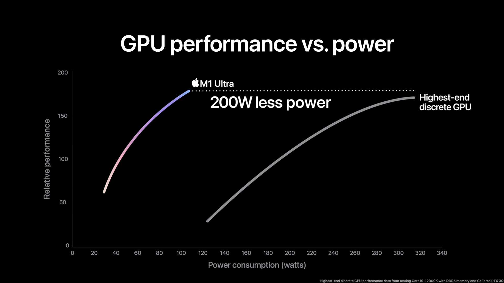 Apple verspricht beim M1 Ultra einen um bis zu 200 Watt geringeren Energieverbrauch bei der GPU-Leistung im Vergleich zu einer äquivalenten Desktop-PC-GPU.