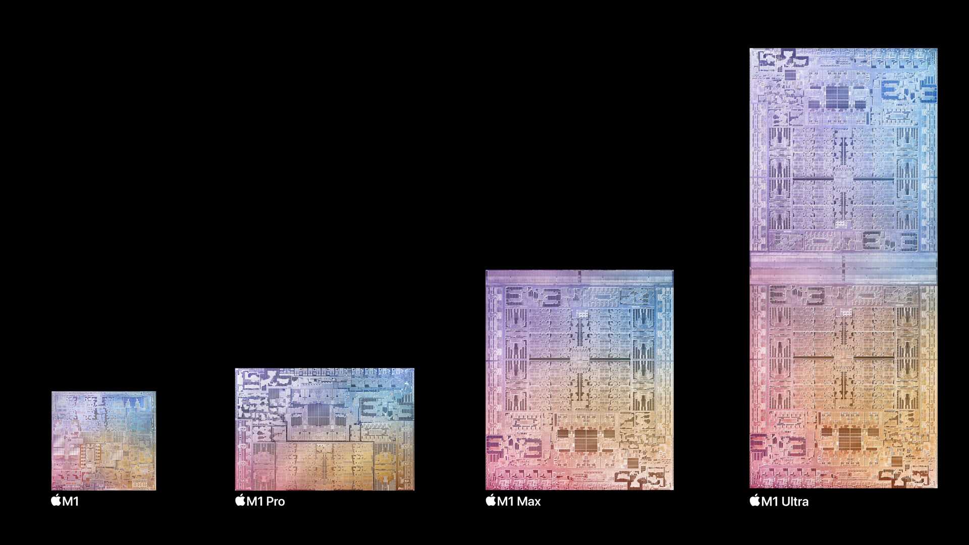 Die einzelnen M1-Chips von Apple im Vergleich. Man erkennt deutlich, dass der M1 Ultra die doppelte Fläche des M1 Max einnimmt.