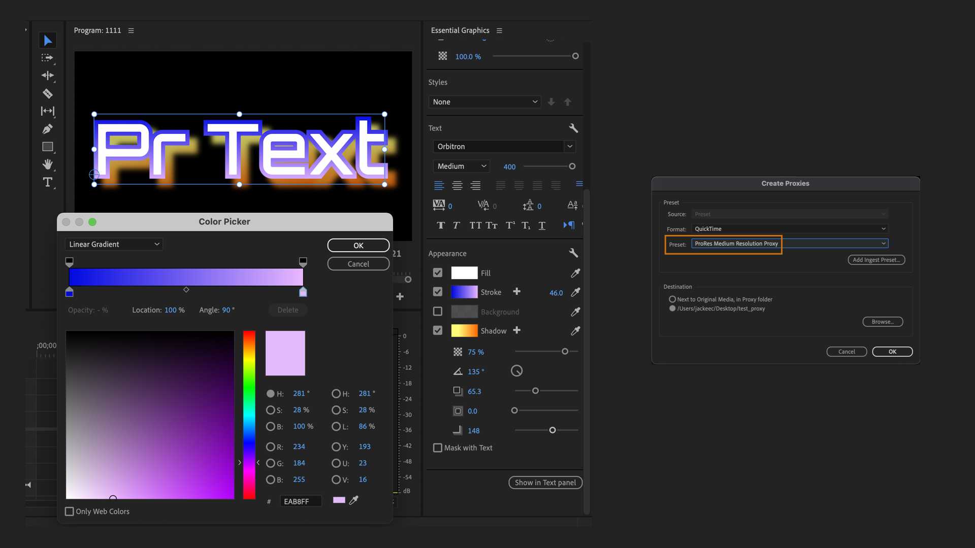 Strichen und Schatten kann man im Texteditor von Premiere Pro CC 2022 jetzt auch Farbverläufe hinzufügen. Rechts sieht man zudem, wo man nun die ProRes-Proxy-Einstellungen in den Projekteinstellungen festlegt.