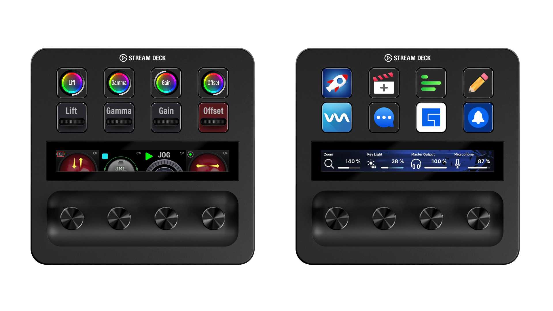 Das Panel des Elgato Stream Deck + lässt sich je nach Anwendung mit einem speziell dafür angepassten Layout belegen. Links sieht man die Toosl für DaVinci Resolve, rechts die für Facebook.