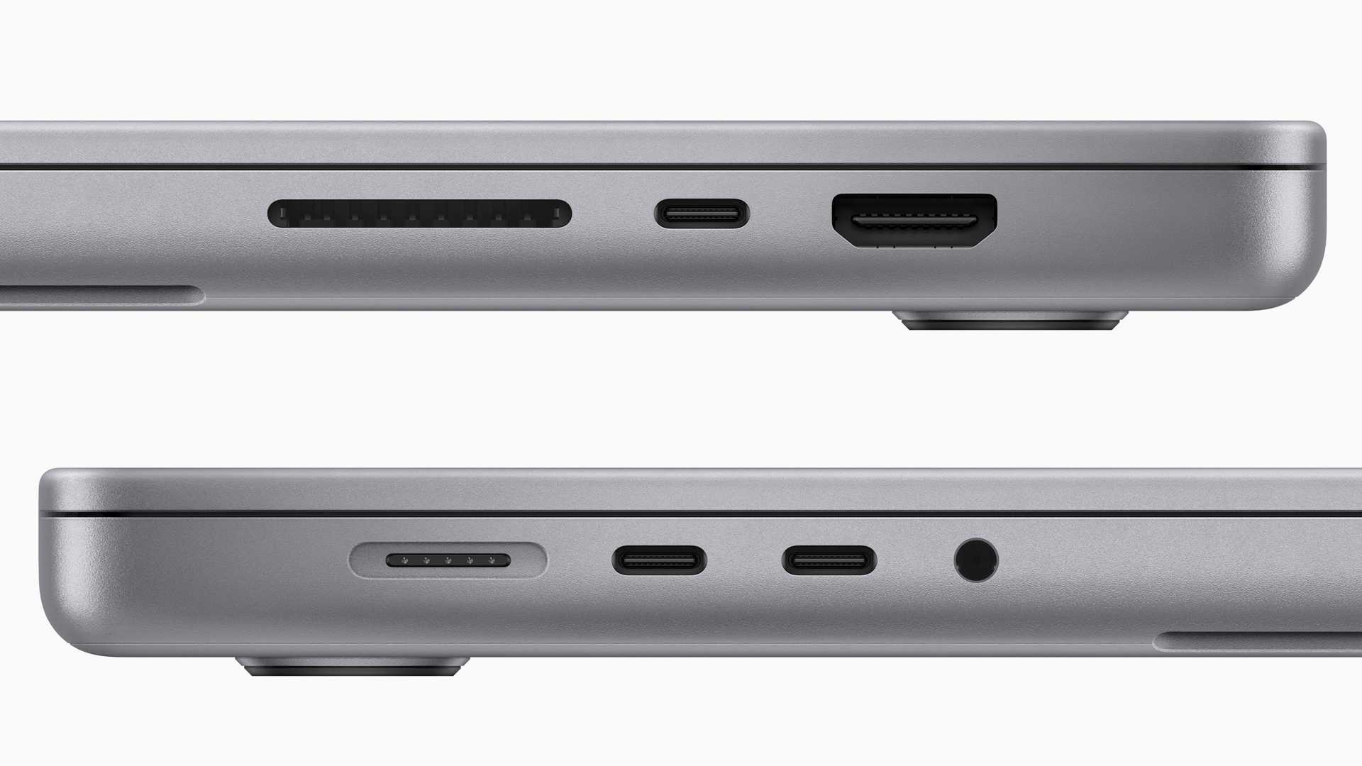 Das MacBook Pro M2 Pro/Max bietet bis zu drei Thunderbolt-4-Anschlüsse sowie einen SD-Kartenleser, Audioausgang und einen HDMI-Port für bis zu 8K mit 60 Hertz.