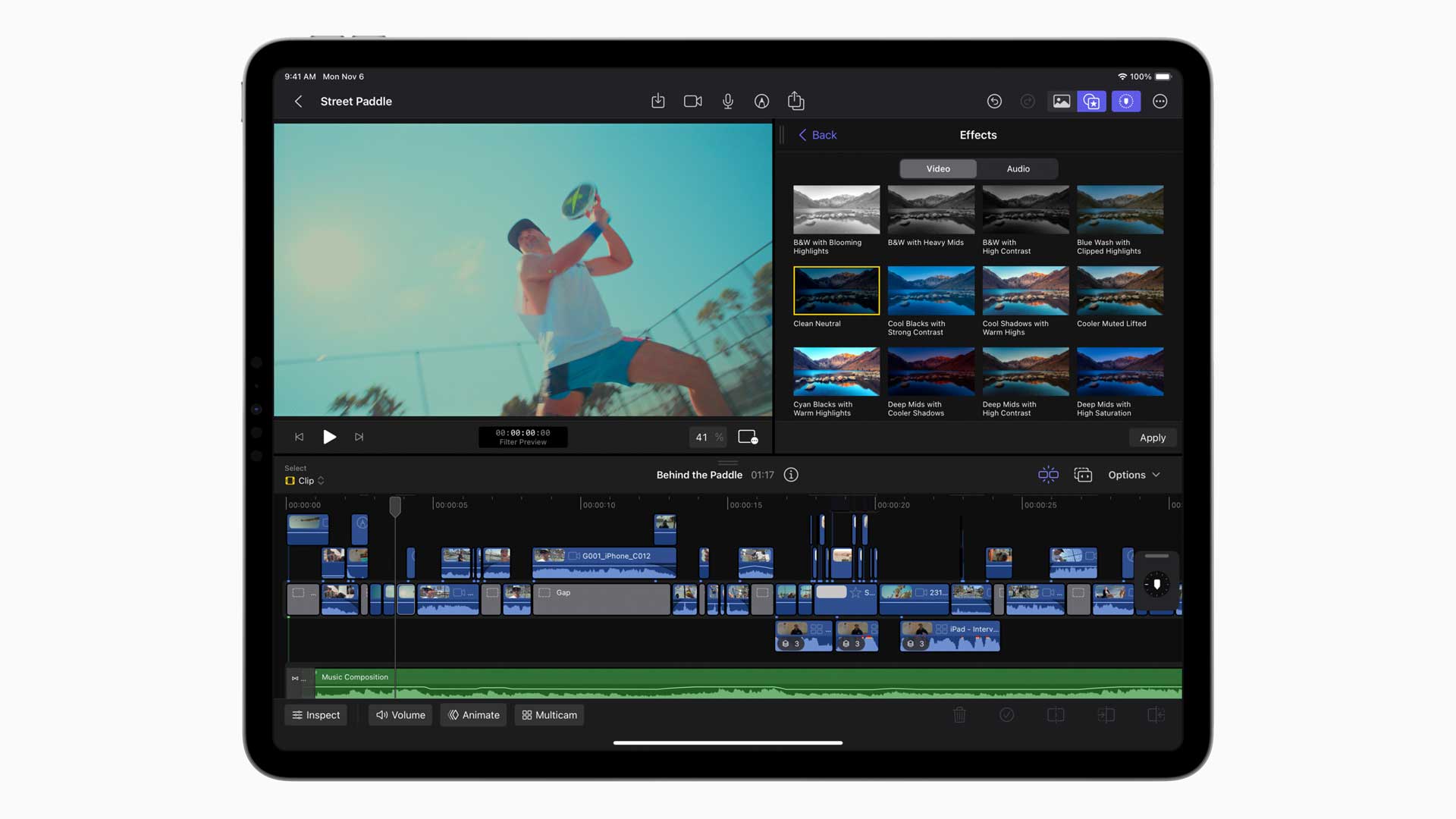 Auf dem iPad kann man Videos nun mit neuen Farbkorrekturvorgaben und einer Auswahl neuer Titel und Generatoren fertigstellen.