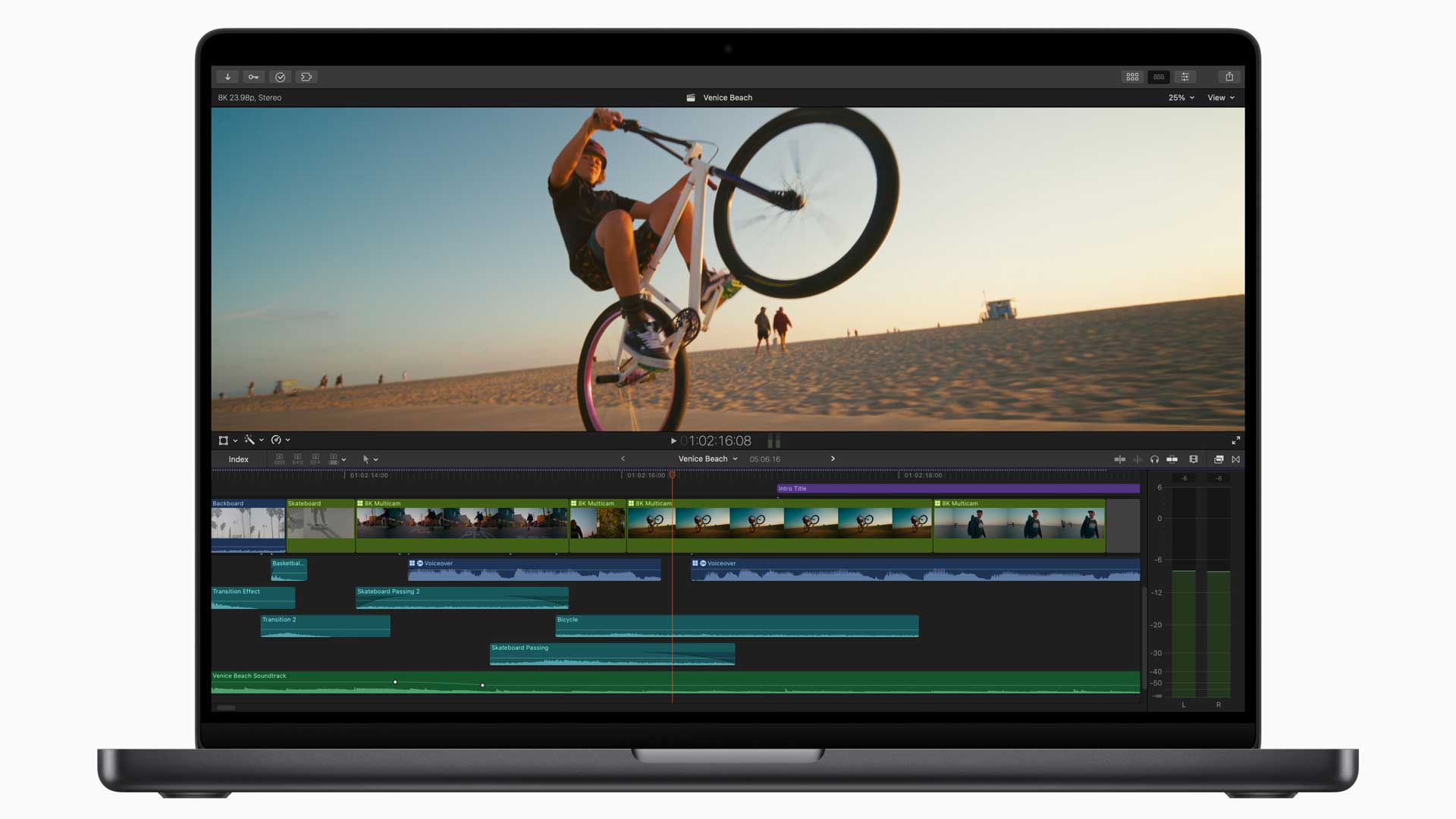 Natürlich unterstützt Final Cut Pro die eben angekündigten neuen Prozessoren, die mit mehreren Media Engines die Geschwindigkeiten beim Export beschleunigen sollen. Man kann zum Beispiel H.264- und HEVC-Exporte beschleunigen, indem man Videosegmente automatisch an verfügbare Media Engines zur gleichzeitigen Verarbeitung schickt. Die Timeline von Final Cut Pro auf dem Mac macht die Orientierung leichter, denn sie hat nun einen automatischen Timeline-Scroll und lässt die Zeitnadel nun immer in der Mitte der Timeline stehen. So hat man Clips während der Wiedergabe besser im Blick, zumal man die Timeline-Ansicht während der Wiedergabe dynamisch anpassen kann. Zudem erlaubt es Final Cut nun Clips verschiedene Farben zuzuweisen und sie so leichter nach ihrer Funktion oder Rolle unterscheiden zu können. Zudem kann nun eine ausgewählte Gruppe von sich überschneidenden, zusammenhängenden Clips zu einer einzigen zusammenhängenden Storyline kombinieren. Verbundene Clips kann man zudem mit bestehenden verbundenen Storylines kombinieren, so dass selbst komplexe Timelines wieder mehr Übersicht bekommen. Natürlich verspricht auch Apple mehr KI: Der Objekttracker soll Bewegungen von Gesichtern und anderen Objekten auf Mac Computern mit Apple Chips analysieren und verbessern, wobei Final Cut Pro die am besten geeignete Analyse auswählt und die passenden Einstellungen anschließend vornimmt.