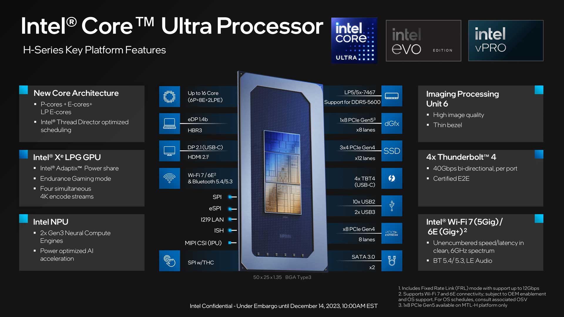 Speziell für KI-Aufgaben gedacht ist die NPU, die über eine Verlagerung von Rechenaufgaben auf die NPU und bei Bedarf parallel der GPU, die Effizienz und Leistung verbessern und zudem die Energieverwaltung optimieren soll. Die CPU-Plattform heißt bei Intel intern „Meteor Lake“ und wird als Core Ultra vermarktet und ist das erste auf der Intel 4-Prozesstechnologie basierende Produkt. Das „i“ aus den Produktbezeichnungen wird Intel streichen und alle CPUs auf Basis der neuen Architektur „Core Ultra“ nennen. Erhalten bleiben allerdings die „groben“ Leistungsklassen 5, 7 und 9, bei den genauen Produktbezeichnungen fängt Intel einfach wieder bei 1.000 an, so dass die Nomenklatura in Zukunft nach dem Muster „Intel Core Ultra 5/7/9 1xxxH(X)“ funktioniert.