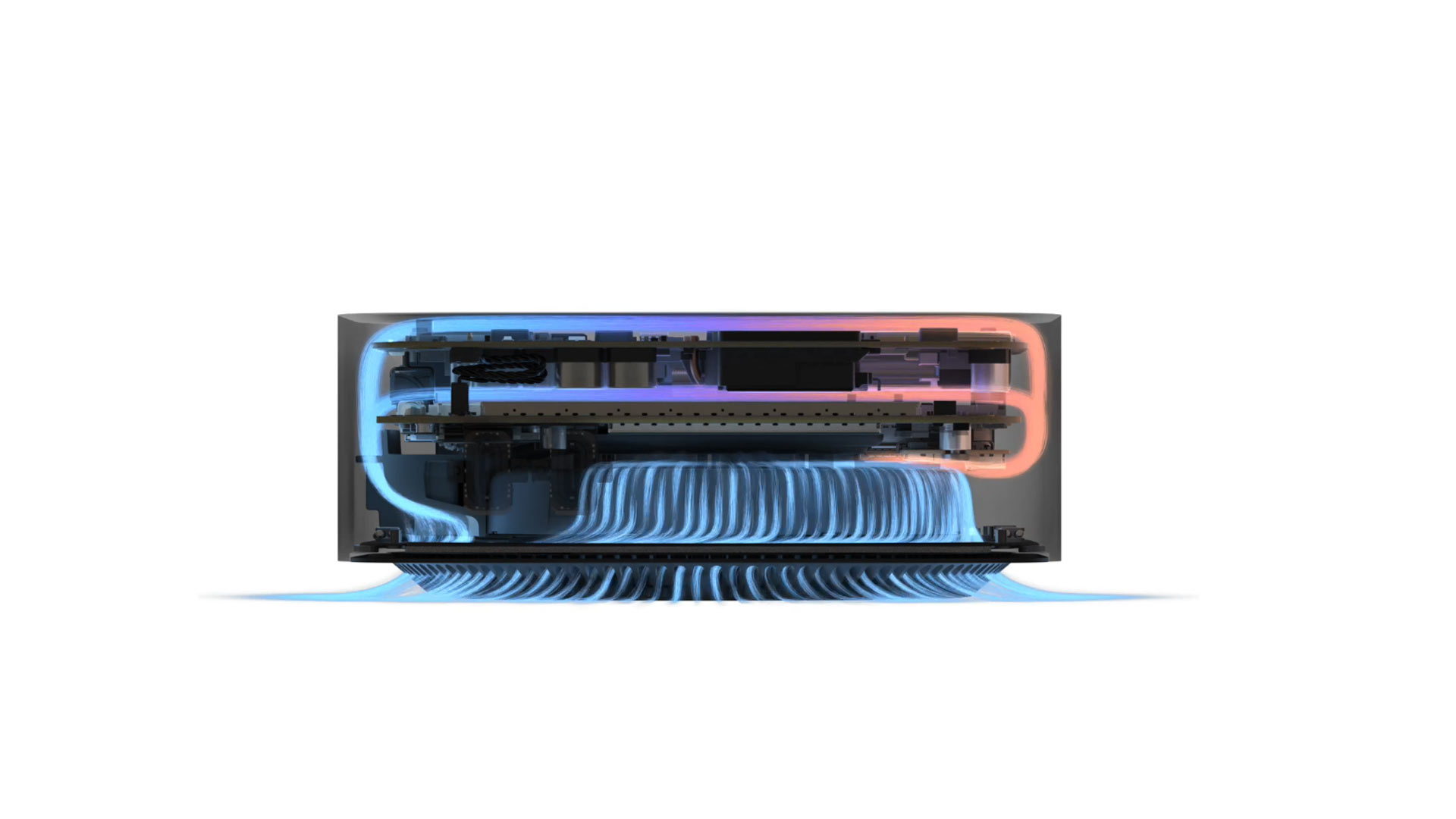 Trotz des kompakten Gehäuses verspricht Apple eine hohe Performance mit effektivem Lüftungskonzept, bei dem die Luft von unten angesaugt und ebenso an der Unterseite wieder austritt.