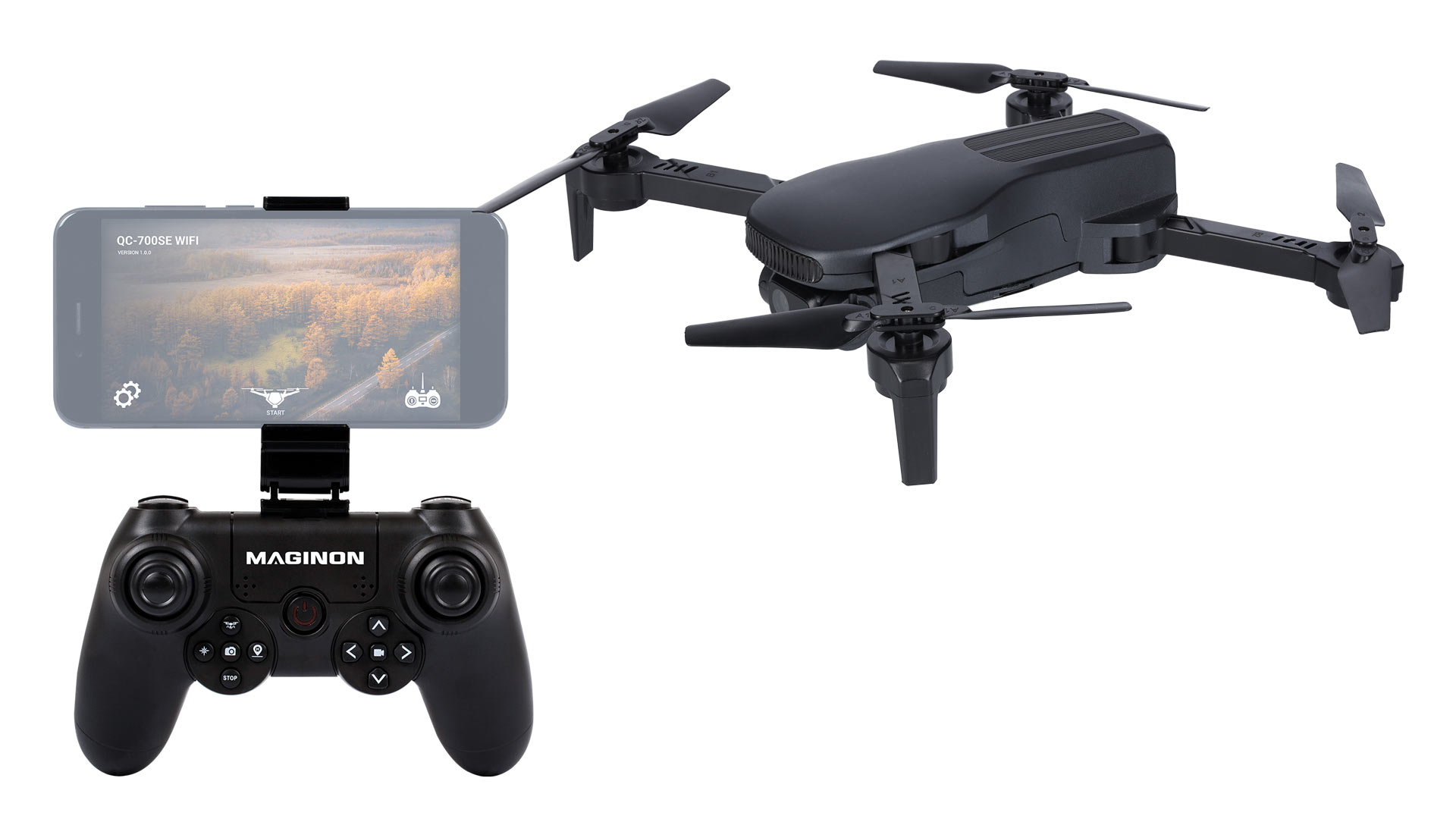 Auch die maximale Reichweite vom im Idealfall 30 Meter spricht für die Zielgruppe der Anfänger, wobei der Hersteller verspricht, dass er bei Wind standhalten kann. Gesteuert wird der QC-800SE via WiFi, wobei die maximale Sendeleistung bei 17 dBm liegt. Die Kamera liefert Full-HD-Auflösung uns lässt sich mit der mitgelieferten Fernbedienung in der Neigung um 0 bis 60 Grad verstellen. Die Fernbedienung bietet eine integrierte Smartphone-Halterung und stellt via kostenloser App „Maginon Air“ den Kontakt via WiFi-Funktion her, so dass man ein Live-Bild auf dem Smartphone-Bilderschirm zu sehen bekommt.