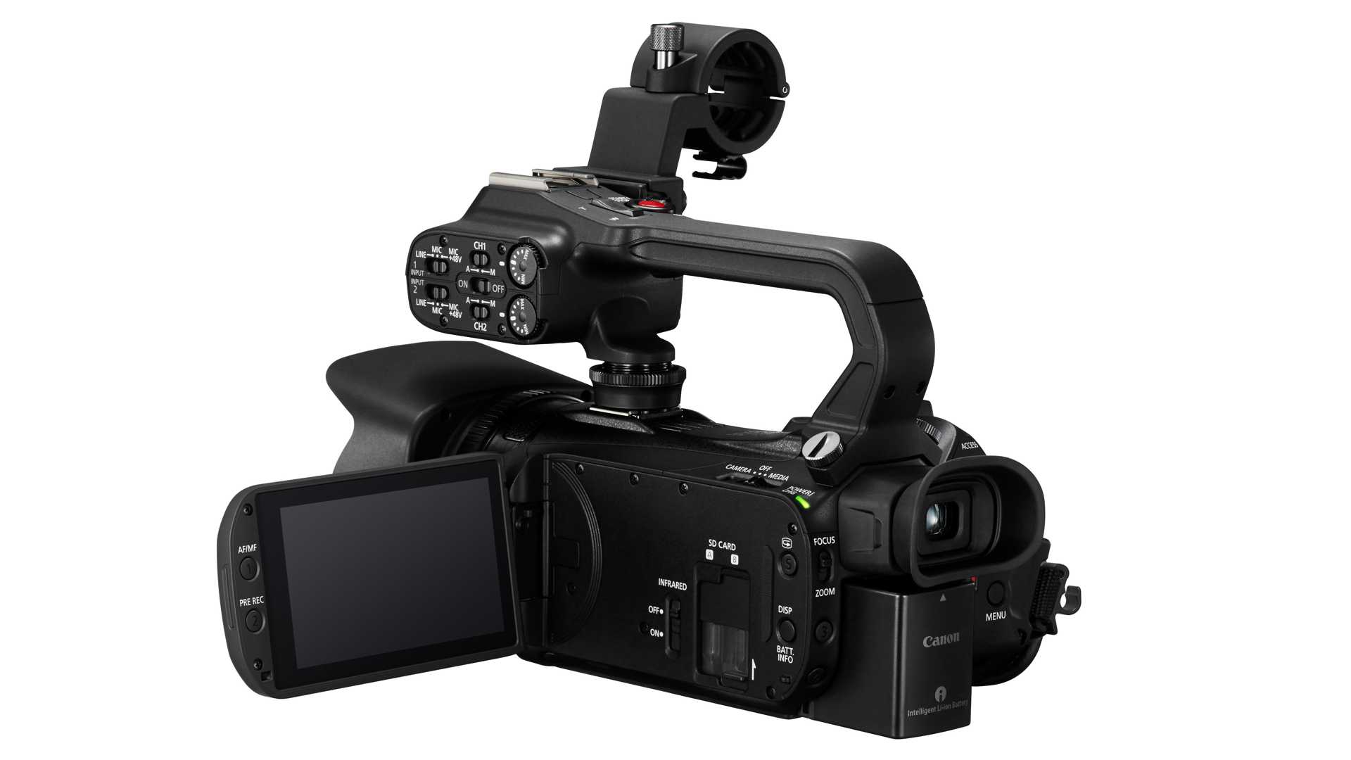 Zudem spendiert Canon den Camcordern nun nicht mehr nur einen ausziehbaren, sondern auch um 45 Grad nach oben klappbaren Sucher mit einen 0,36 Zoll-Display und 590.000 RGB-Bildpunkten. Der LCD-Touchscreen ist auf 3,5 Zoll (8,9 cm) angewachsen und bietet 920.000 RGB-Bildpunkte – allerdings nur bei den Modellen XA70/75. Bei den kleineren Varianten misst das Display nur 3 Zoll (7,6 cm) und liefert nur mäßige 153.000 RGB-Bildpunkte. Bei allen Modellen soll allerdings die Helligkeit des Displays deutlich verbessert sein. Den Vorschriften der EU folgend ist nun der Stromanschluss geändert: Die Camcorder werden per USB-C mit Saft versorgt. Zudem bieten sie eine Aufnahmefunktion mit den auf dem Onscreen-Display angezeigten Daten, womit Canon den Anforderungen bei Überwachungen gerecht werden und somit neue Kundschaft finden will. Alle Modelle verfügen über einen HDMI-Ausgang. Nur die Modelle XA65 und XA75 bieten zusätzlich einen 3G-SDI-Ausgang. Alle vier Profi-Modelle bieten zwei XLR-Audioeingänge und die 4-Kanal-Audioaufnahme.