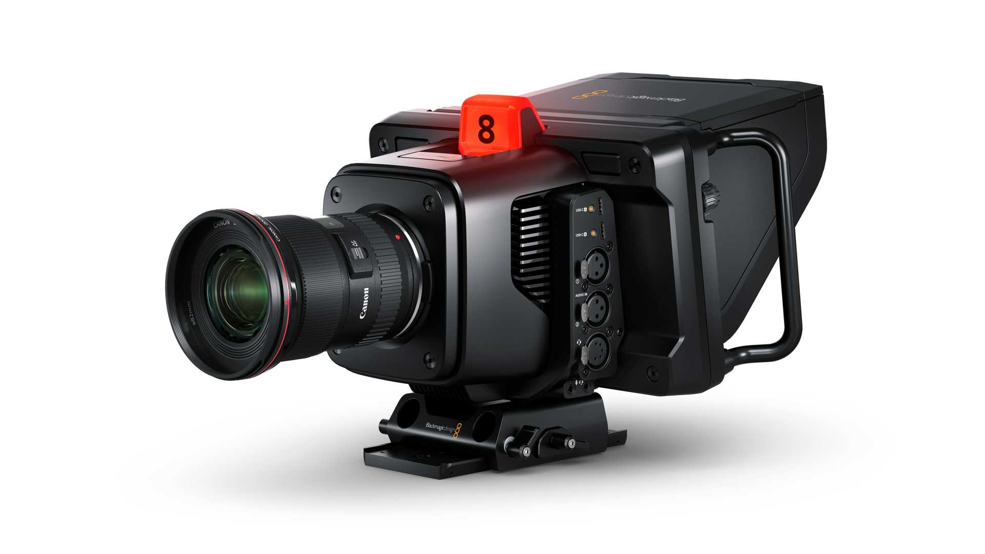 Der Sensor ist für ISO-Werte bis 25.600 ausgelegt. Die erweiterten Funktionen umfassen Talkback, Tally, Kamerasteuerung, einen integrierten Farbkorrektor, Blackmagic-RAW-Aufzeichnung auf USB-Laufwerke und mehr. Den Farbkorrektor kann man dann auch mit einem Bildmischer steuern. Mit dem Dynamikumfang von 13 Blendenstufen sind die Schwarzwerte der Kamera dunkler und die Weißwerte heller, und sollen daher natürlich eine besonders gute Voraussetzungen für die Farbkorrektur erlauben. Die gängigen EF- und MFT-Objektivanschlüsse der Blackmagic Studio Cameras sorgen für Kompatibilität mit einer Vielzahl von Fotoobjektiven. Mit optionalen Focus und Zoom Demand Steuergeräten, die an die Stativarme angebracht werden, kann man sich dann auch das Umgreifen für manuelle Anpassungen am Objektiv sparen und die Kamera wie eine große Studiokamera handhaben.