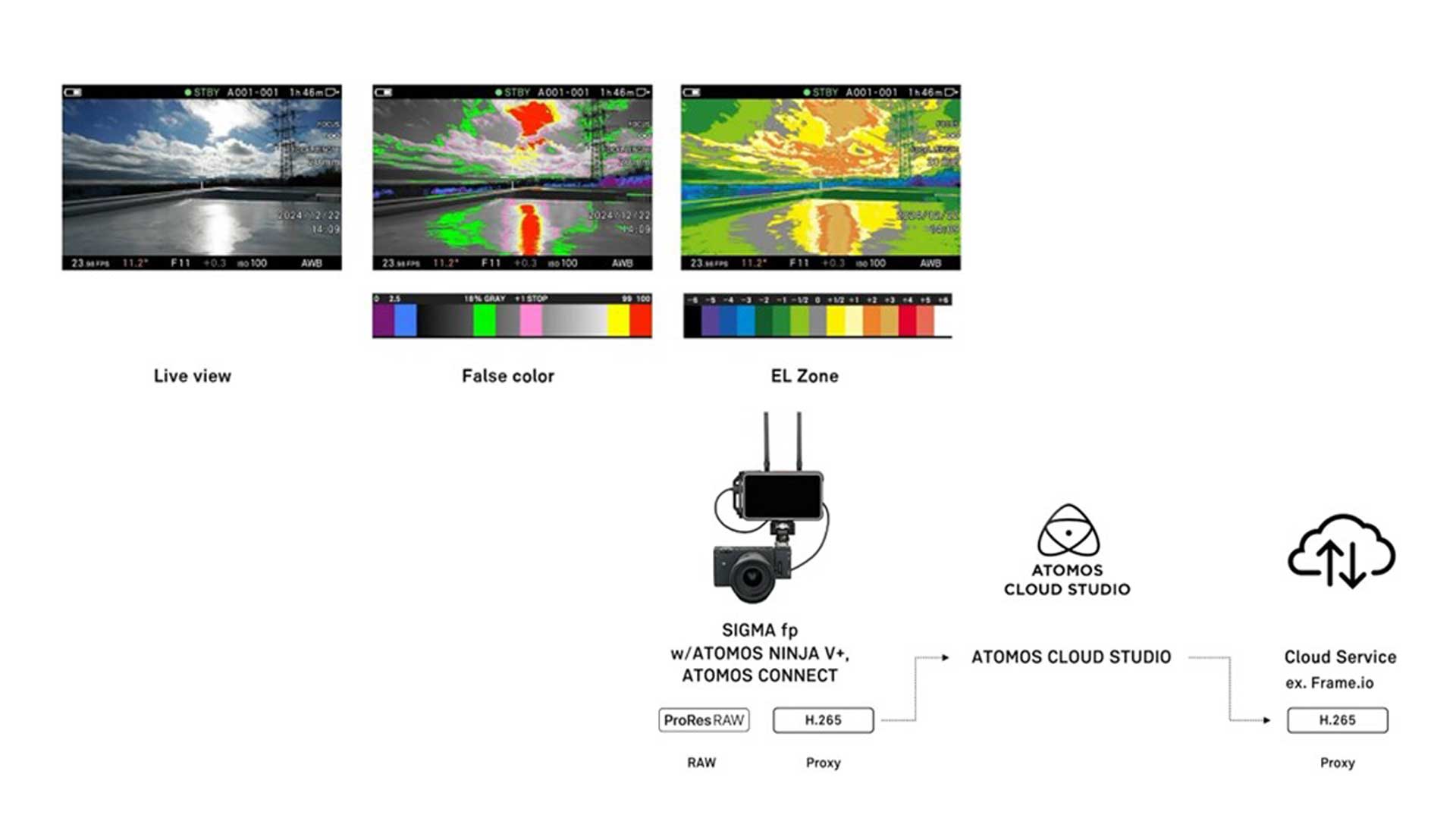 Mit der EL Zone bekommt man eine genauere Auswertung des Dynamikumfangs und somt mehr Informationen wie bei False Color wo lediglich Überbelichtungen angezeigt werden. Neu ist zudem die Kommunikation mit der Cloud mithilfe der Atomos Geräte.