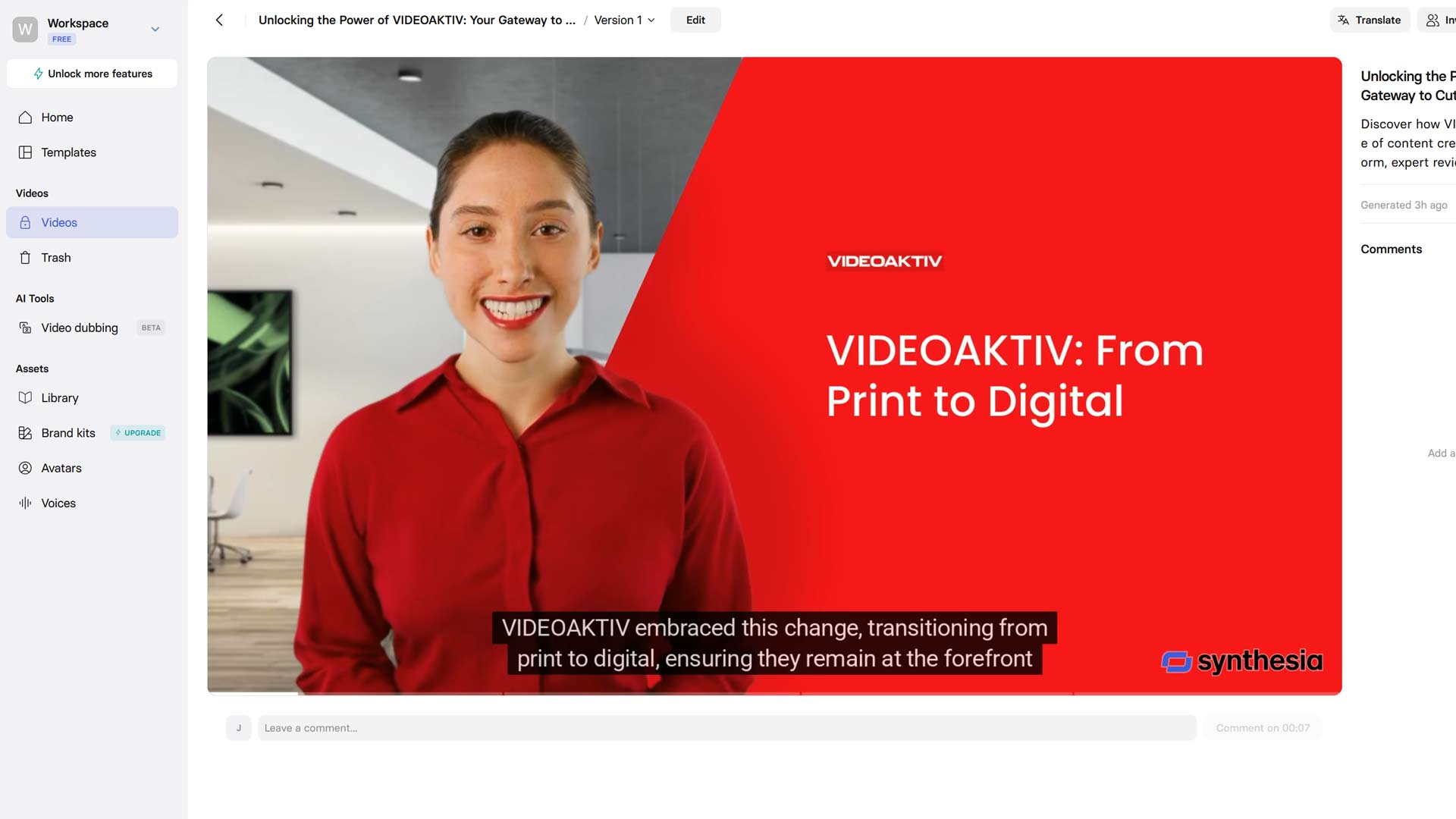 ... in ein Video das man, zumindest als zahlender Kunde, dann noch vereinern kann. Nur bei der Free-Version ist das Video mit synthesia gelabelt.