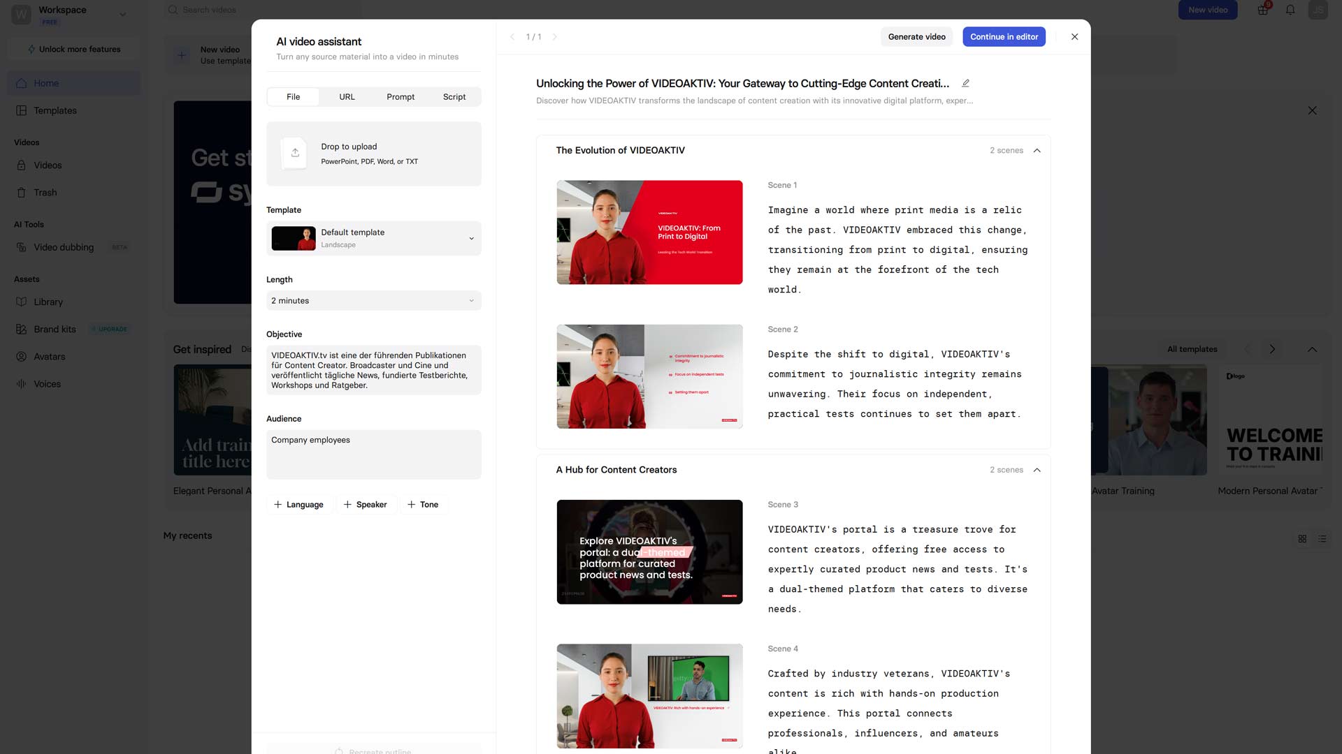 Synthesia erlaubt den Upload von Dokumenten - zum Beispiel aus Werbebroschüren. Das tool zieht sich dann dann das Wissen aus dem Dokument und verarbeitet es mit einer Sprecherin und realtiv ordentlich passendem Bildmaterial ...