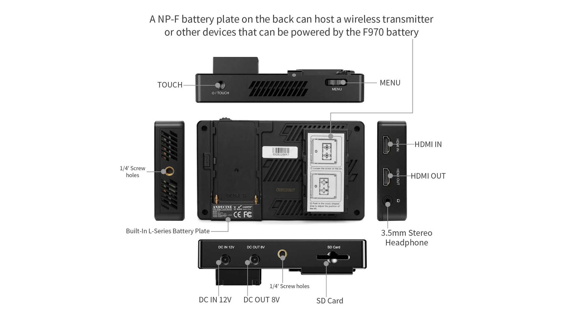 Mit Strom speist sich der Monitor etwa über einen NP-F550-Akku (L-Serie-Akku) und erlaubt es auch ausgewählte Kameras oder Zubehör über einen 8-V-DC-Ausgang und einen separat erhältlichen DC-Koppler mit Energie zu versorgen. Dazu gibt es die Option einen drahtlosen Empfänger mit einer NP-Batterieplatte zu montieren. Aufs Stativ oder die Kamera kommt er per 1/4"-20 Anschluss. Damit der Monitor kühl bleibt, gibt es diverse Lüftungsschlitze am Gehäuse. Zudem ist ein Lüfter integriert, der aber auf geringer Leistung leise vor sich hinarbeiten soll. Der Andycine C5 bietet diverse bekannte Hilfsanzeigen für die Aufnahme, wie Waveform, Vector Scope, Peaking Filter, Exposure, False Color und mehr. Zudem unterstützt er 3D Luts und nutzt das eigene „Andy OS UI“ für den Betrieb und die Steuerung.