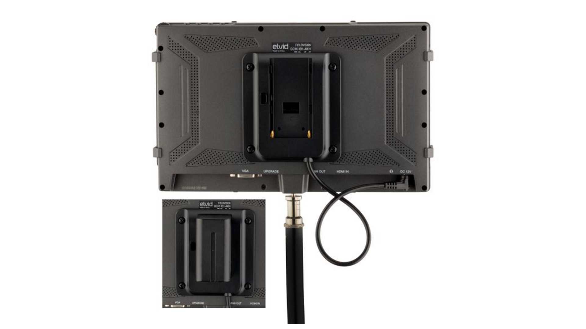 Akksu nutzt der Elvid OCM-101-4KH im NP-F-Format und erlaubt alternativ die Stromversorgung über das mitgelieferte Netzteil.