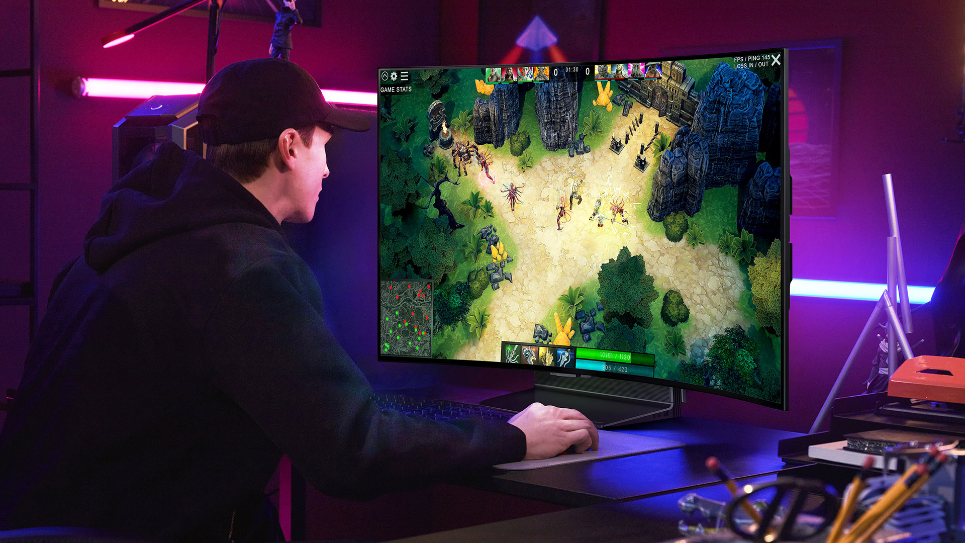 Der OLED Flex soll sich sowohl für für Konsolen-, PC- und Cloud-Gaming, als auch Live-TV-Übertragungen und das Nutzen von Streaming-Diensten eignen. Er liefert ein Bild im 21:9-Format, wobei es LG versäumt, die native Auflösung anzugeben. Allerdings spricht der Hersteller von einer Unterstützung von 4K bis 120 Hertz inklusive Dolby Vision, wie es alle aktuellen LG OLED TV können. Zudem wird HDMI 2.1 geboten, inklusive variabler Bildrate (VRR) und Auto Low Latency Mode (ALLM), was in erster Linie für Gamer interessant ist. Weiter gibt es eine Switching-Hub-Funktion, mit der man das integrierte Mikrofon des OLED Flex sowie die über USB angeschlossenen Geräte wie Headset, Tastatur oder Maus mit einem über HDMI-Kabel angeschlossenen PC wechseln und nutzen kann. Für den Wechsel des Quellsignals gibt es dabei an der Seite des Standfußes eine eigene Taste. Das eingebaute Mikrofon bietet laut LG eine effektive Echounterdrückung.