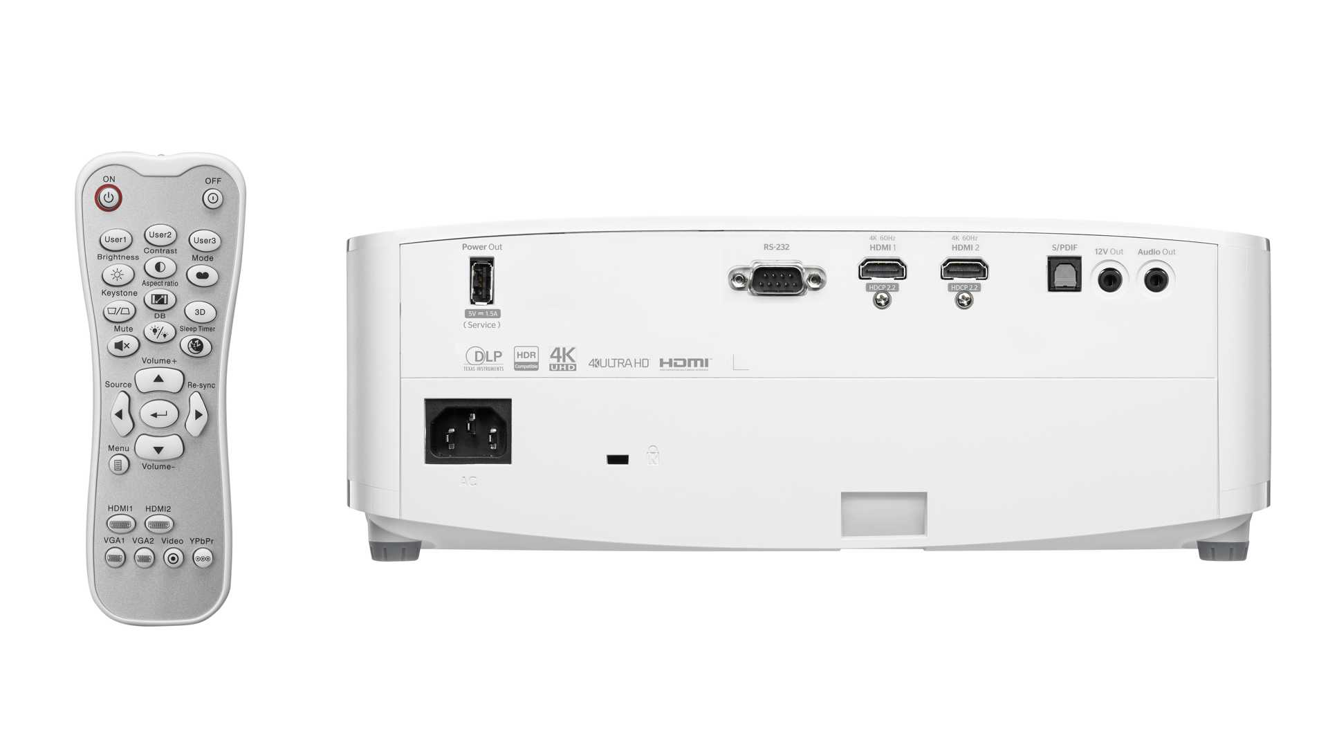 Die Anschlussleiste des Optoma UHD35STx bietet zwei HDMI-Buchsen sowie S/PDIF und weitere Audio-Schnittstellen. Die mitgelieferte Fernbedienung hat beleuchtete Tasten.