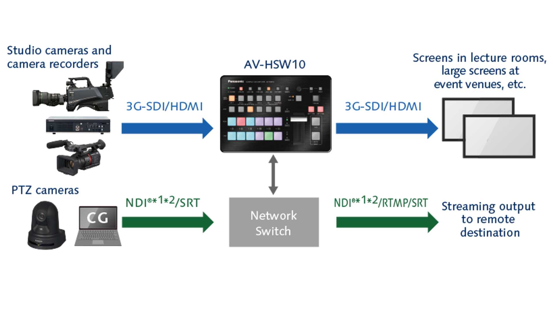 Der AV-HSW10 unterstützt auch RTMP für den direkten Upload zu Streaming-Diensten und „USB-Video-Class“ für die Kommunikation mit Webkonferenzdiensten. Dabei lassen sich die Systeme je nach Standortgröße und Plattform anpassen und damit auch der Ein-Personen-Betrieb von der Produktion bis zum Vertrieb realisieren. Der AV-HSW10 ist ferner kompatibel mit dem Panasonic Software Control Panel zum Anzeigen von Videos und Bildern in Anwendungen sowie für das direkte Umschalten von einem PC über ein Netzwerk. Damit sind dann auch bis zu 16 Fenster über einen Multiview-Output gleichzeitig darstellbar.