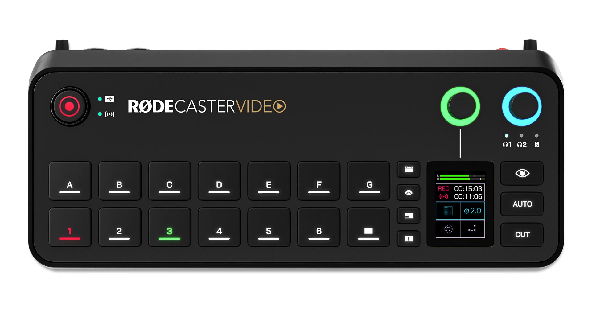 Das übersichtliche Bedienfeld des RØDECaster Video soll eine intuitive Steuerung bereitstellen, wozu große, dedizierte Tasten integriert sind. Diese ermöglichen das Umschalten von Videoquellen und Szenen, das Starten und Stoppen von Aufnahmen, das Aktivieren automatischer Übergänge sowie den direkten Zugriff auf Funktionen wie Chroma-Key-Steuerung, Multi-Source-Layouts, Grafiken und Medien. Über die sieben Szene-Taster soll man eine komplette Produktion planen und ablaufen lassen können, denn jeder Taster kann benutzerdefinierte Layouts enthalten, die mehrere Videoquellen, Bilder, Videos und Chroma Key Inputs umfassen. Mit dem „Inspect“-Taster lässt sich dabei überprüfen, welche Szene einem Taster zugeordnet ist und diese bei Bedarf anpassen.