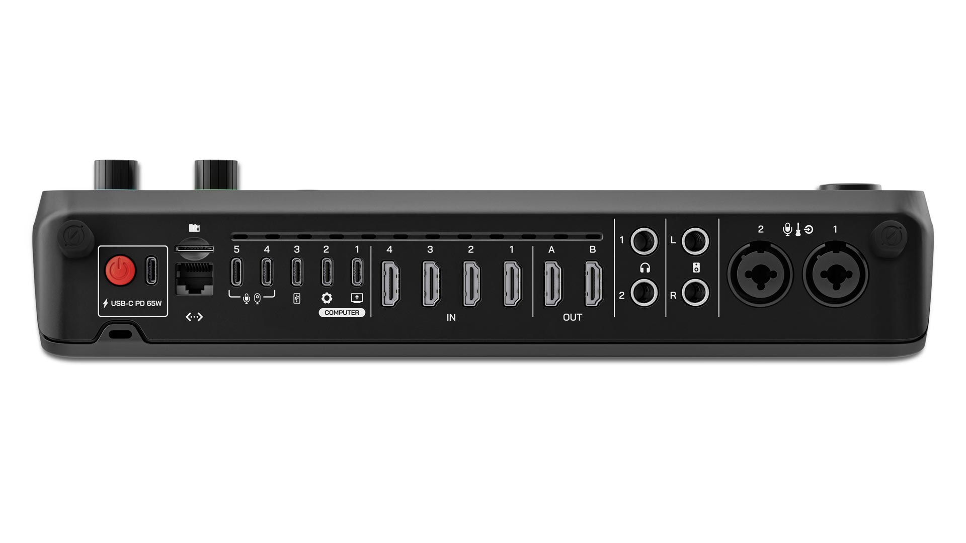 Das intelligente Auto-Switching ermöglicht automatisierte Kamera- oder Szenenwechsel basierend auf dem Audiosignal – ideal für Einzelanwender oder kleine Produktionen. Die kostenlose RØDE Central-Software bietet zudem erweiterte Konfigurationsmöglichkeiten und Fernsteuerung. Der RØDECaster Video verfügt über zwei Neutrik Combo-Buchsen, integrierte Drahtlos-Empfänger für RØDE Wireless Mikrofone, USB-C Ports und Bluetooth. Damit unterstützt er XLR-Mikrofone, Line- und USB-Audioquellen sowie Bluetooth-Quellen. Neben HDMI-Anschlüssen und einem Ethernet-Port bietet der RØDECaster Video insgesamt fünf USB-C-Ports und einen microSD-Kartensteckplatz, über den MP4-, JPG-, PNG- und WAV-Dateien eingespielt werden können. Zwei 6,35 mm Kopfhörer-ausgänge und zwei symmetrische 6,35 mm Lautsprecherausgänge befinden sich auf der Geräterückseite.