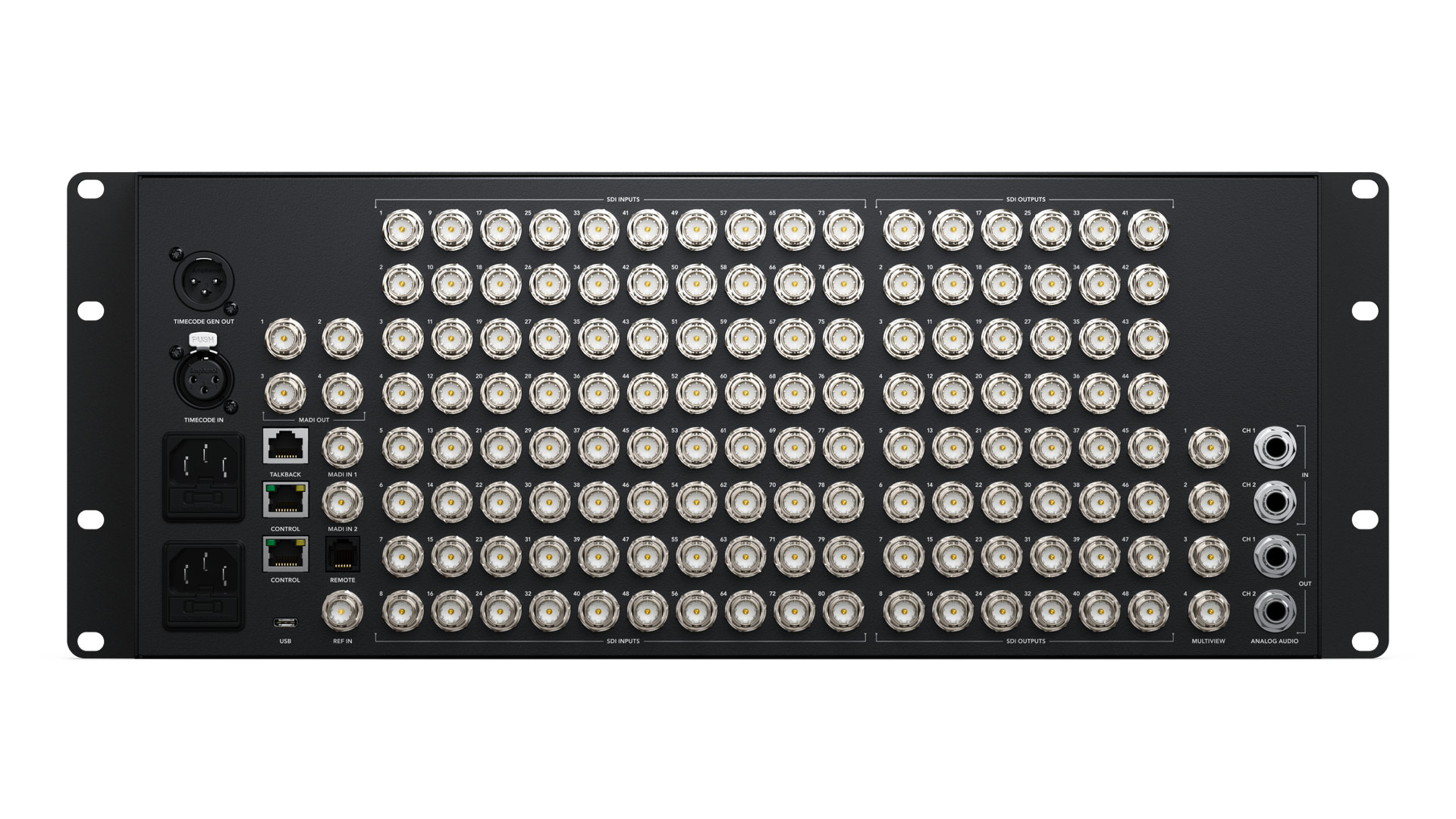 Die Rack-Montage deutet es an: der Atem 4 M/E Constellation Plus soll in großen Studios, Ü-Wägen und ähnlichen hochwertigen Produktionsumgebungen ein Zuhause finden. Dafür ist er mit 80 12G SDI-Eingängen und 48 ebensolchen Ausgängen umfangreich ausgestattet. 16 Atem Advanced Chroma Keyer, jeweils vier UHD-Media Player und UHD-Multiviewer sowie zwei SuperSource-Prozessoren erweitern den Mischer, der außerdem über einen Fernbedienungsanschluss, XLR-Timecode-Anschlüsse sowie drei Ethernet-Ports (Control, Control, Talkback) verfügt. Die analogen Audioein- und ausgänge sind in Stereo als doppelte Klinkenbuchse ausgelegt, dazu gibt es zwei MADI-In- und vier MADI-Out-Anschlüsse. Abgerundet wird das Anschlusspanel von einer dedizierten RJ12-Fernbedienungs- und einer USB-C-Buchse.