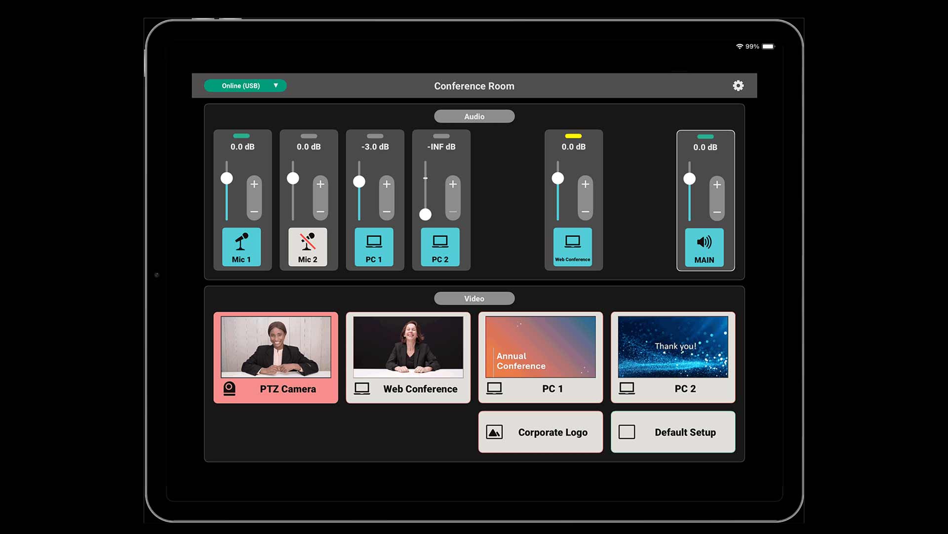 Selbst wenig erfahrene Nutzer sollen dank der VenuSet-App die Videomischer leichter bedienen können. Dazu lässt sich die App flexibel anpassen und erlaubt es Systemintegratoren, individuelle Steuerpulte mit den benötigten Funktionen für verschiedene Anwendungen zu erstellen. Dies ermöglicht die Fernsteuerung von Video-Switches, Audiopegeln, Szenenerinnerungen, Grafikpräsentationen und mehr. Weitere Audio-Prozessoptionen sind Hochpassfilter, Noise Gate, Stimmenwechsler und Reverb. Mit VenuSet lassen sich Szenen-Speicher aufrufen, Makros verwenden, Sequenzen abspielen und automatische Schaltungen ausführen. Externe Steuerungen wie die Aufnahmeüberwachung und GPO (General Purpose Output) sind ebenfalls integriert. Zudem gibt es eine umfassende Kamerasteuerung sowie Aufnahmefunktionen für Streaming-Inhalte und einen Videoplayer.