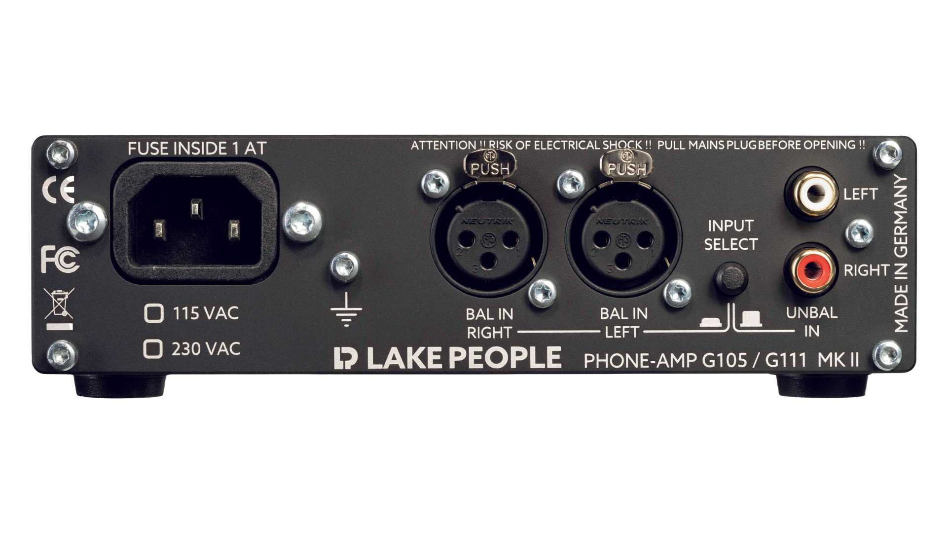 Der Lake People G105 Mk II bietet professionelle Anschlüsse für XLR sowie Stereo-Cinch und einen Umschalte für den Quellen-Eingang.