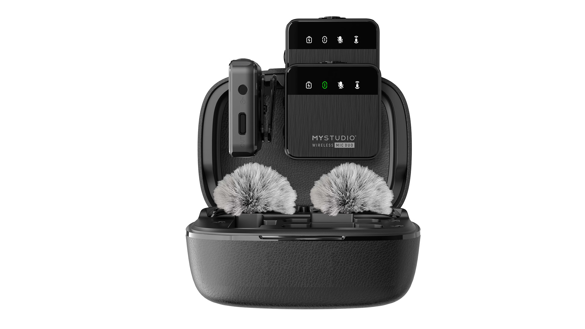 Das MyStudio Wireless Mic Duo kommt mit zwei Mikrofonen (jeweils 23 Gramm) und einem Empfänger (23 Gramm) und kommuniziert sowohl mit Kameras als auch dem Smartphone. Mit dabei im Setz ist hier ein duales 2-in-1 USB-C-Kabel, ein USB-C-Verbindungskabel und ein 3,5mm Klinke-Kabel für verschiedene Anschlussoptionen. Beide Mikrofone verfügen über einen 3,5mm Audioeingang, falls man sie auch anderweitig anschließen möchte. Für die Verwendung mit bestimmten iOS-Geräten ist ein Apple-Kopfhöreradapter für Lightning auf 3,5mm-Klinke-Adapter notwendig. Gefunkt wird mit 2,4-GHz-Datenübertragung, wobei Easypix eine stabile Verbindung verspricht. Die Mikrofone, sowie der Empfänger sind dabei bereits vorkonfiguriert und zwei mitgelieferter Windschutzaufsetzer sollen bei „windigen“ Aufnahmesituationen Tonrauschen verhindern helfen. Die Signalreichweite soll bis zu 150 Meter betragen.