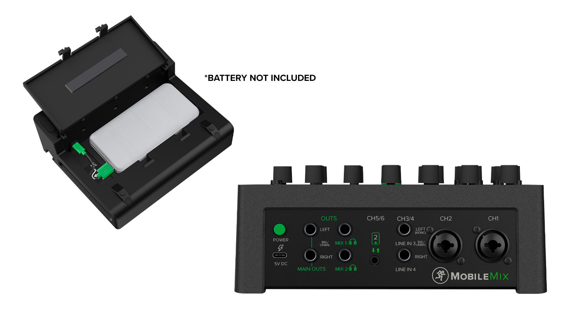 Ein Batteriefach im eigentlichen Sinne hat das MobileMix nicht. Stattdessen geht Mackie mit der Zeit und offeriert einen Powerbank-Anschluss an selbiger Stelle, was je nach verwendetem Akku längere Betriebsdauern ermöglicht.