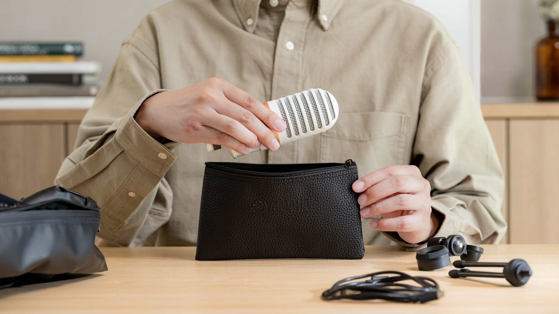 Yamaha liefert die Kabel und ein kleines Tischstativ, sowie eine Transporttasche mit.