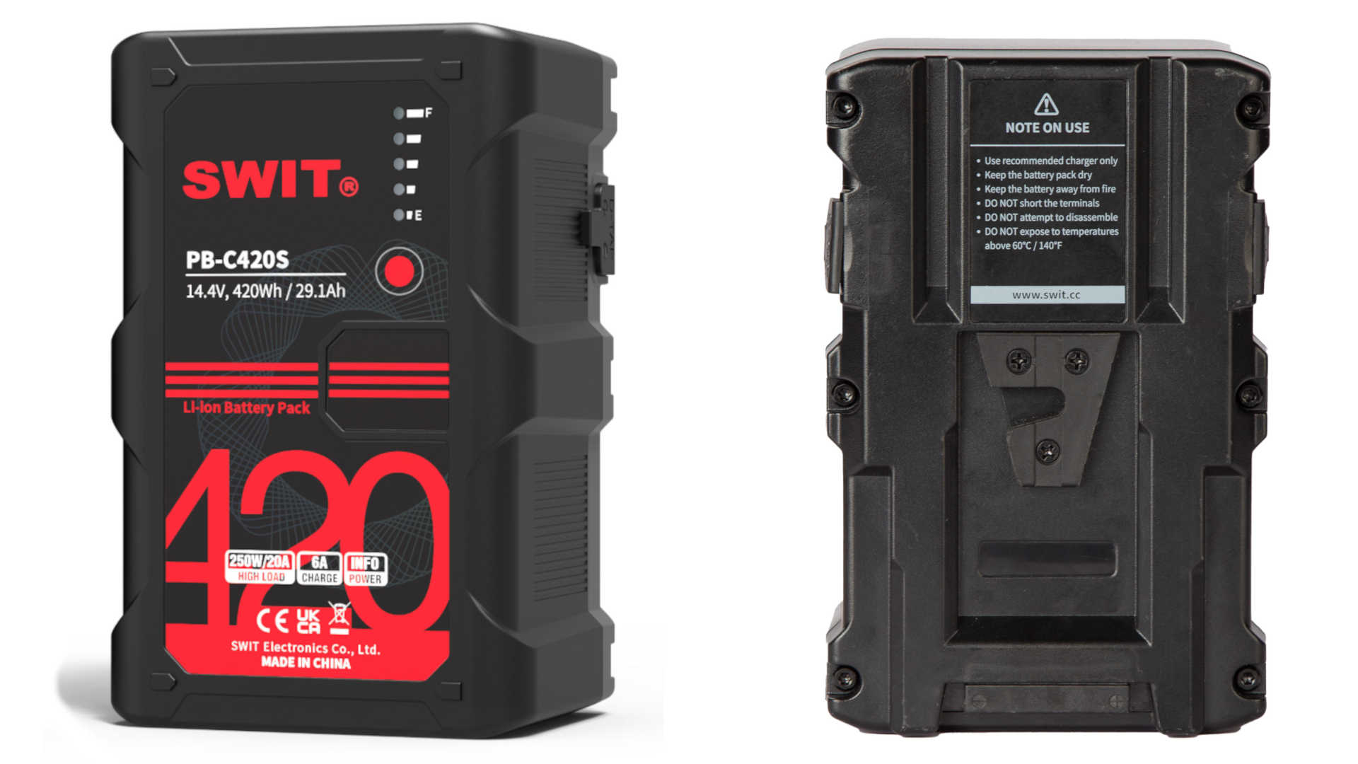Der Swit PB-C420S bietet riesige 420 Wh Kapazität und ist für Kamerasysteme mit V-Mount-Akku-Option von RED oder auch Sony geeignet.