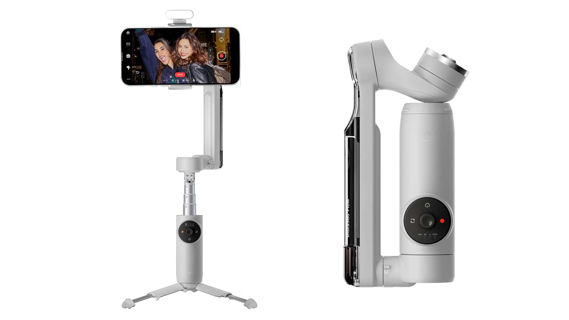 Neben der weißen Variante gibt es noch eine graue. Das Gimbal nimmt das Smartphone magnetisch auf, kommt aber auch mit einer Klemme. Es lässt sich vergleichsweise kompakt zusammenlegen.