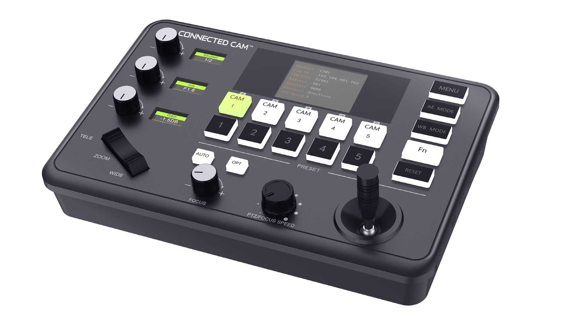 Mit dem RM-LP5G Connected CAM ein PTZ-Joystick-Controller steuert man ein kleineres Setup von mindestens zwei PTZ-Kameras.